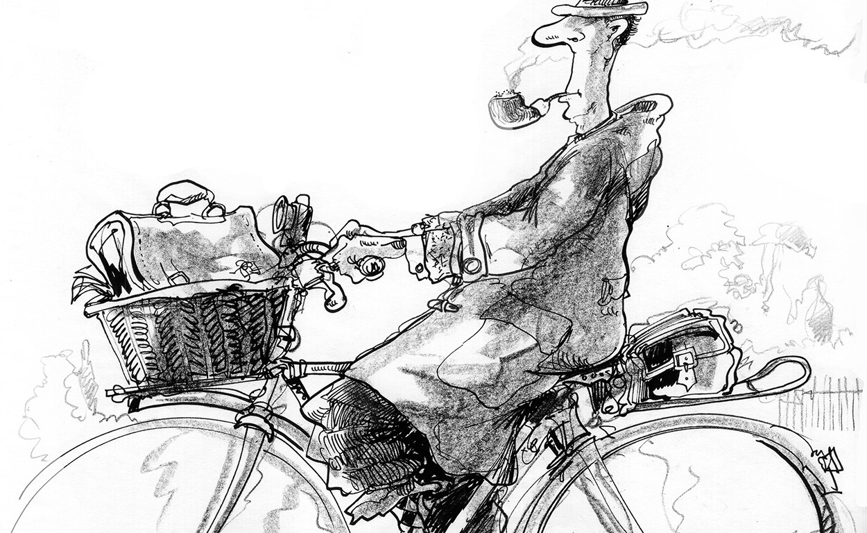 Here’s another of those missing persons, with words by Gordon Thorburn. The drawing is based on my old history master who was a gem of the species names Mr Trethewey. Even the name was right. He did, as I recall, smoke his bike whilst pedalling and I always had the impression that he was burning old compost in there.