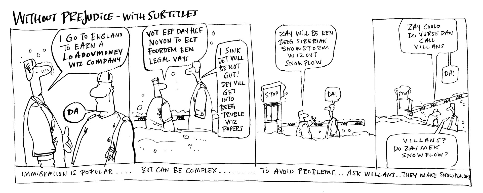 Digging through some old paperwork I came across this cartoon strip. I used to have a regular commission for a local firm of lawyers for their newsletter.They’d give me a grey old crusty subject and then I’d be forced to find something trivial and hopefully marginally amusing to draw up a strip for them. This one was about paperwork for people coming to this country. This is just the rough but it needs no faffing to get across the meaning.