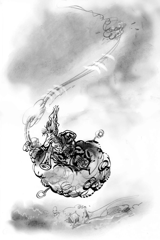 She put the vanilla ice cream in the bucket, added a good lump of the black boot polish, mixed it up and then poured in the lemonade. As soon as there was enough dark grey froth to make a small cloud, she said the magic words, sat on it, and flew to Nosepipe.
