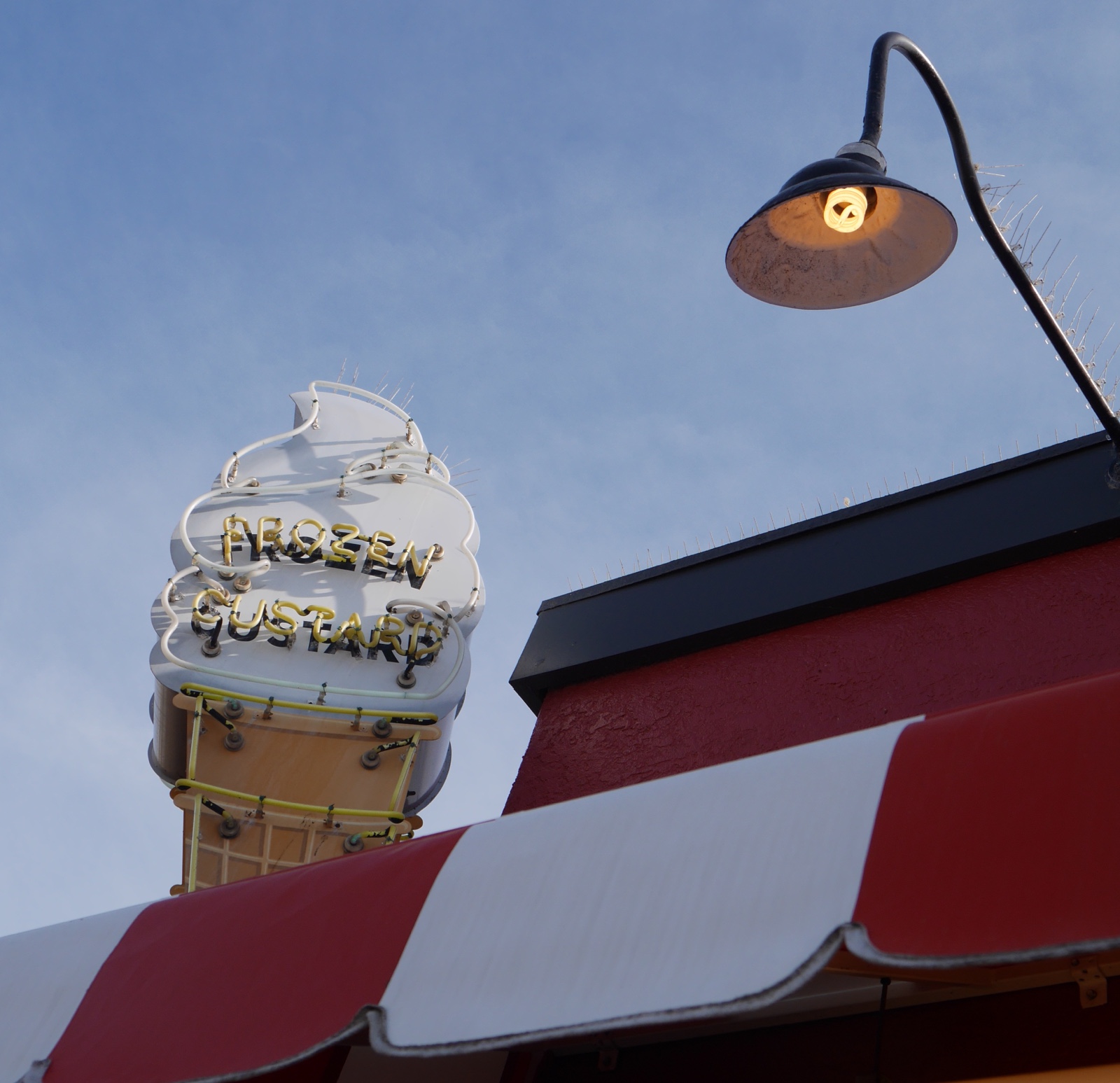 I like the sign but not the sentiment. I suppose that with temperatures in the summer being baking and in the winter like now, just a mere 70 degrees then freezing your custard might be a good idea. Americans are fond of apple pie, but they appear to freeze their custard!