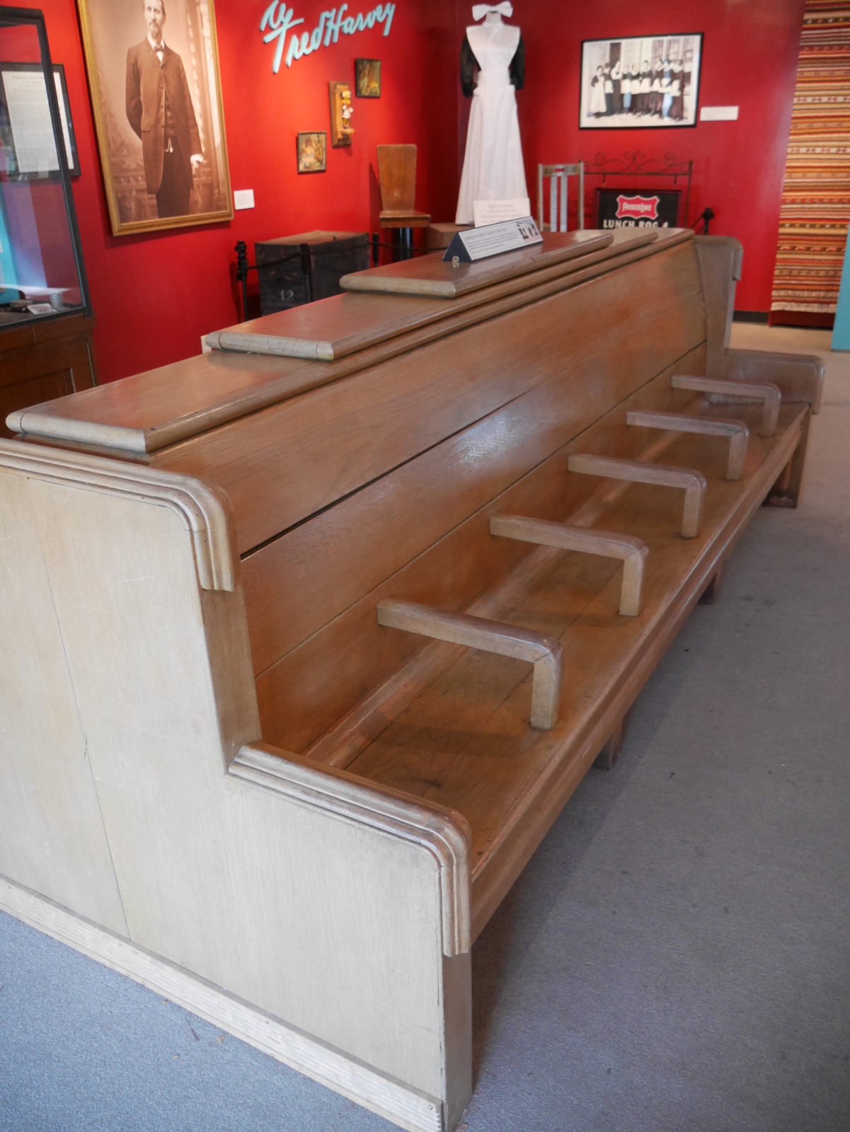 The photograph above was taken in a small part of the train museum which has a permanent display of artefacts from what might be called the golden age of train travel in the US. Every last thing was thought about down to the crockery and the cutlery. There are examples in the glass cases as can be seen here. And what brilliant graphics were used in those days with these understated designs. I was very taken by the beautiful bench from a railway station waiting area too.