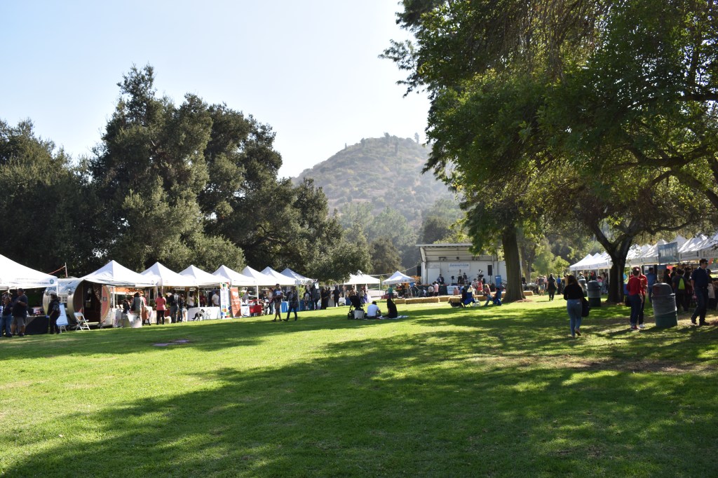 Well, we went with the family, to a small gathering at Griffith Park, which was billed as a Harvest Fesitival. Not in a religious way, but just a celebration for the time of year organised by someone who thought it a good idea. It was helped by the reliable weather: hot and sunny. They laid on little stands for people to find out about the area and/or what they did for the City. So there were people pushing hiking trails, some with local beauty products, a beer tent, a few food trucks ( more about these later ) a German band complete with lederhosen singing ‘I love to go a wandering’ and other German classics, and a stand where Ron Galperin was offering information, free sunglasses and lip balm.