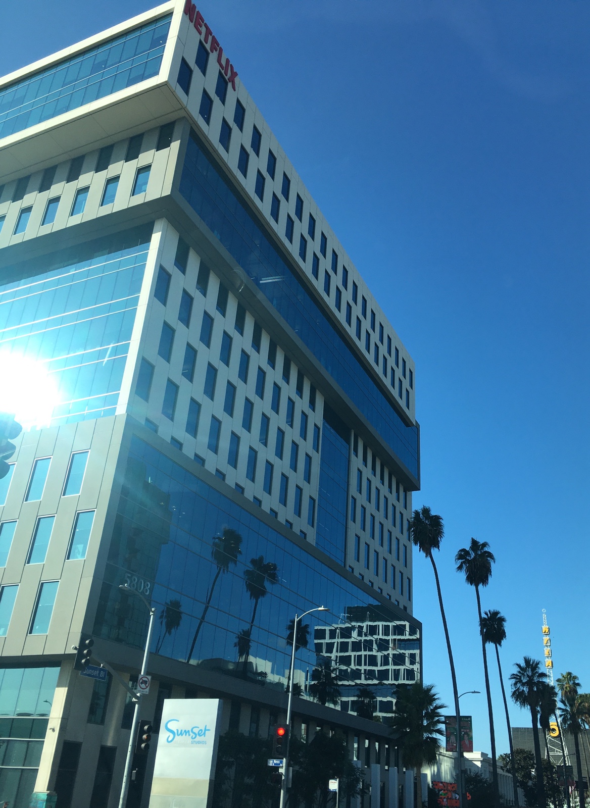 Latest films get the entire side of a building.That’s the Netflix building on the right with the mix of what seem to be black windows. The building is designed like a load of slabs that have moved a bit in a shake up. Also below, gives a better impression of the design.This ginormous slab of a building is a high schoolNot everything is big and bold. Fluff and fold?