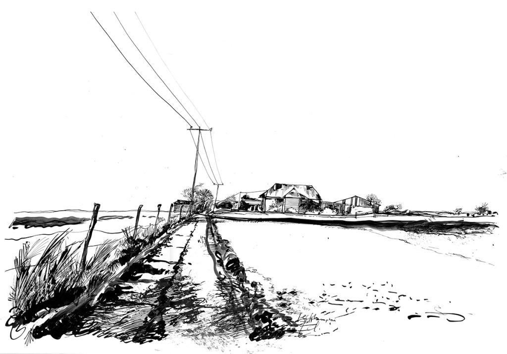 It’s up above Cheltenham and there on the top is the back way to Leckhampton Hill. This is part and just the start of a series of drawings I’m doing of landscapes. They start like this as simple line work and then get the digital treatment from then on. Indian ink on coated board and perhaps a bit of whiting out here and there, but in this case none, this is just the line work. It’s actually quite big drawing, around A2.