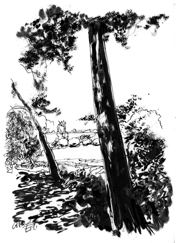 Taken from a photo the drawing is in my usual Indian ink, applied with brush, sometimes toothbrush ( I use a separate one for my teeth ) and a cheap dip pen. It’s on coated card so the ink goes on a treat.