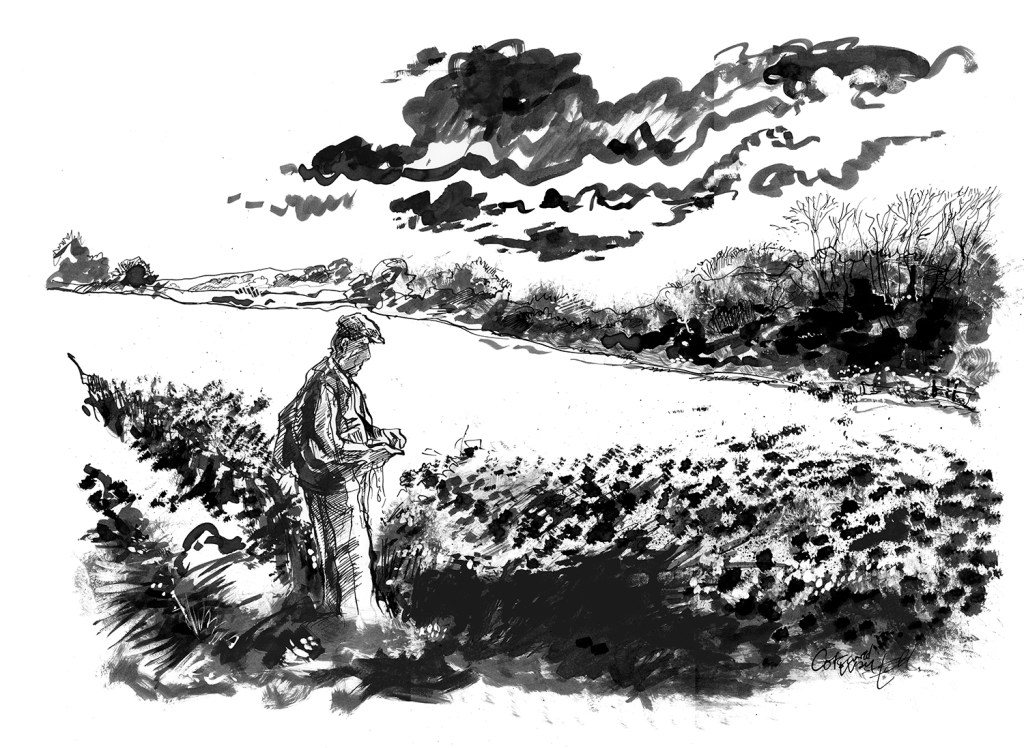 I’m undecided about this drawing, wether to re-work it or to plough on and see what happens with the colour. Robin, my sometime walking companion was checking his phone making sure, no doubt, that we were not lost out there on the Cotswold Way, some months ago. That band of white behind him is a field of oil seed rape. I’m reticent about showing you the original photo as you’d probably prefer it to the drawing.