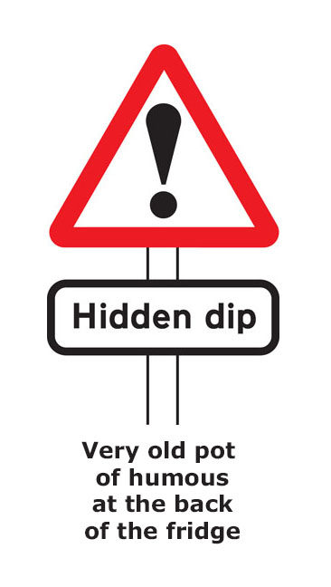 Assuming that you have been buying stuff “just in case”, it may be a lesson in checking at the back of the fridge. I seem to remember making this joke when teaching my daughter to drive ( not much teaching but plenty of left leg brake exercise for me ) and I would say “Watch out for the taramasalata when you go over this next hill in the road”. She usually just told me to shut up with my “Dad Jokes”, but it helped calm my nerves.
