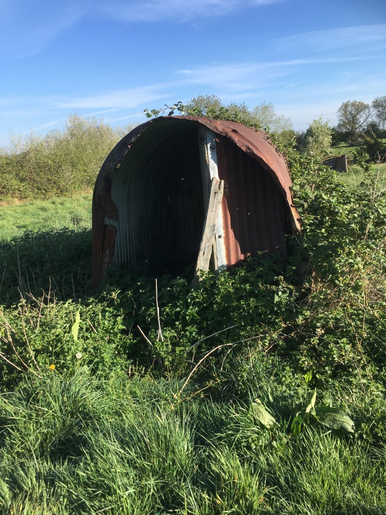 2. Looks to me as though your local farmer has dug up and reused the corrugated iron to make a shed / pig sty. He possibly just used what remained of a larger structure; which you would expect, if it hadn’t rusted away underground over the decades. The curved sheets certainly do look the part!