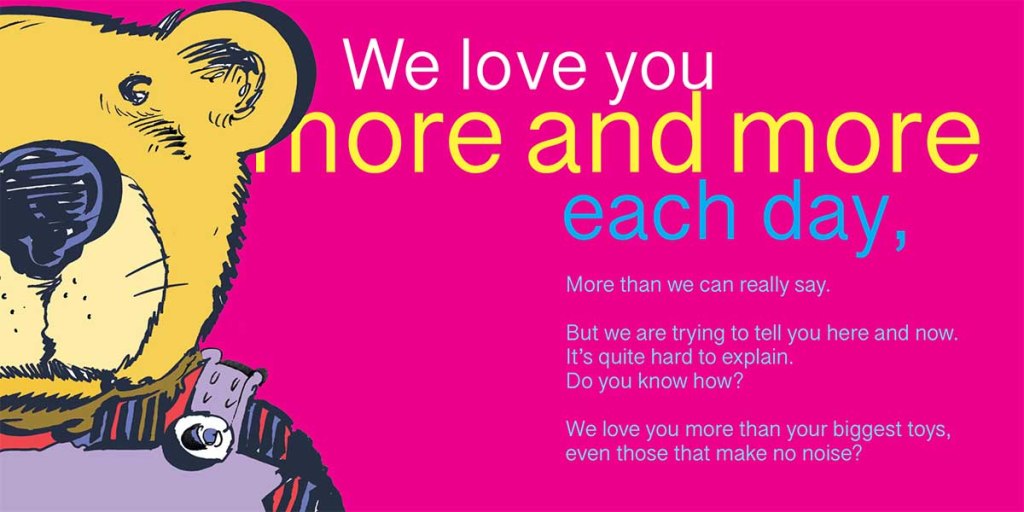 A book to be read to small children by immature adults illustrating exactly how much you love them.This small book is 120 x 120mm and 28 pages including the cover and is in full colour throughout, you can buy the book from here or direct from Longfield shops in Cheltenham and Stroud. If bought from here I will send copies to you via mail. Limited edition, only 100 copies printed. Get yours now. Feel free to pay more, it all goes to Longfield.