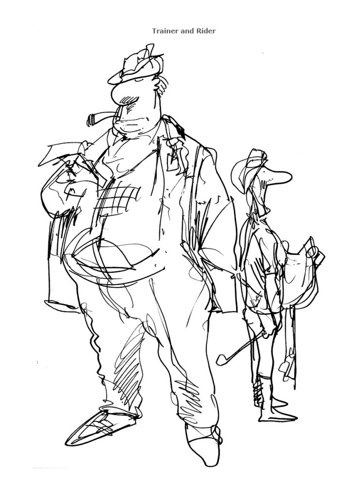 A few drawings unearthed in recent days, when I thought of doing a series on horse racing. I have some limited experience in the field having worked at Haydock Park when I was 16, where my duties included cutting birch trees on Lord Derby’s estate a few miles away which were then transported down the East Lancs Road on a trailer pulled by a tractor, with me on the top of the load with a red flag! Picking litter after a race day and cursing the losers who tore up their betting slips and littered the grandstands, and ‘treading in’ after a race. This involved putting back the divots and then treading them back in, for the next race. It looked like a bunch of old guys and a youth ( me ) rocking back and forth in a sort of slow line dance.