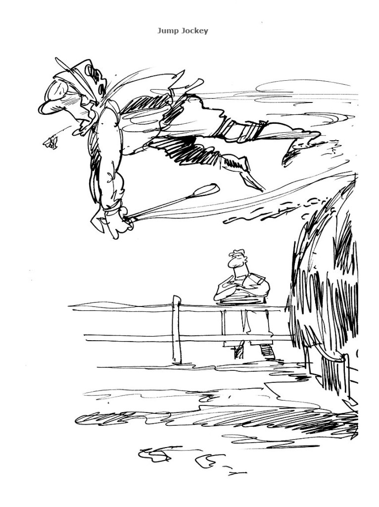 This incorporates a couple of themes from recent posts about racing. I can’t claim to have witnessing a jockey leaving his horse at a fence like this, but I do know that at Haydock Park, where I worked in my college holidays on the ground staff, that there was always an ambulance ready for such an eventuality. To say it is a dangerous sport is something of an understatement. Very small men clinging on to a beast with much more muscle than Tyson Fury, who have been kicking them and come armed with a whip, can just be a little too much for these sensible beasts. They can stop on a sixpence ( that was the currency in the 70s when I was last at a racecourse) The result can only be imagined, and that’s what I’ve done here: imagined it.