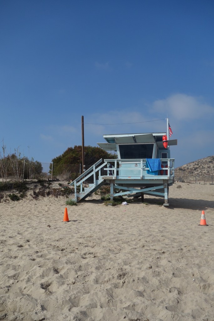 Most beaches on the Californian coast have parking lots for you and you simply step out of there onto the sands. The only beach hut you might find is occupied by fit tanned people with binoculars looking out to the heads and bodies bobbing in the waves waiting to ride the surf. The lifeguard huts are present on most beaches and are generally to the same design as this pictured here.