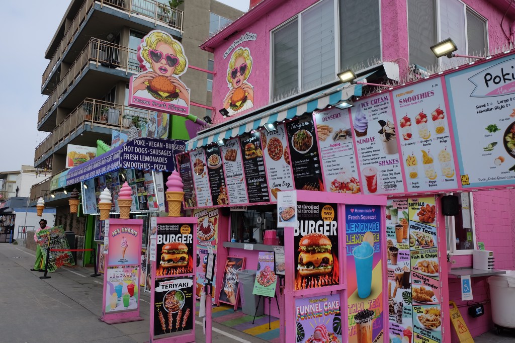 I’ve been to Venice Beach a couple of times before, many years ago I stayed with a fellow illustrator/ cartoonist and our agent ( yes , I had a spell being represented by an agent ) when we all went on a business trip to L.A. He hired an apartment for us all on Venice Beach. He was that type of guy who felt the need to be cool. He rented a Ford Thunderbird convertible for himself and Phil and I made do with a small Toyota Claris which was the sort of car that one’s Aunty Clarice might have driven. I’m not sure that the car was called a Claris, but it might have been.