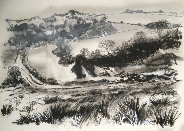This is the black and white version. Drawn in Indian ink and then a little bit of grey pastel added, for atmosphere. I’m hoping to get the same sort of feel, but in colour of course, for this next version. It was photographed on a winters day, but with a lot of sunshine around. Precious few moths around then.