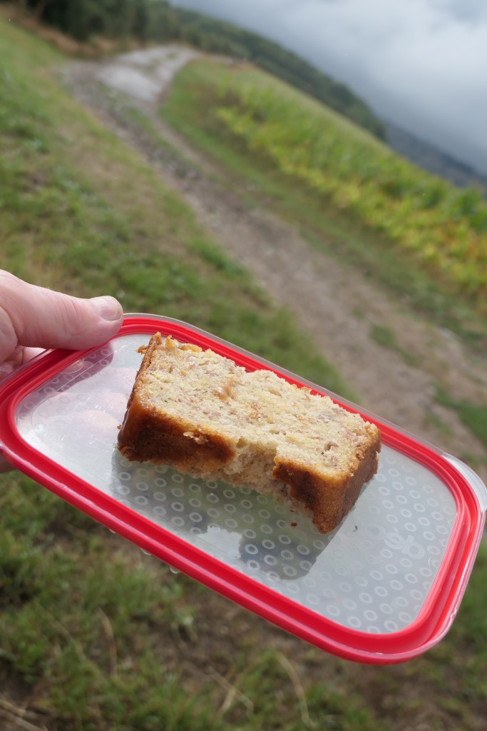 Another good walk, and it dried up enough for us to partake of some stunning cake from Mike’s wife culinary hands: banana and thyme. We had it with a warming thermos of tea. Lovely.