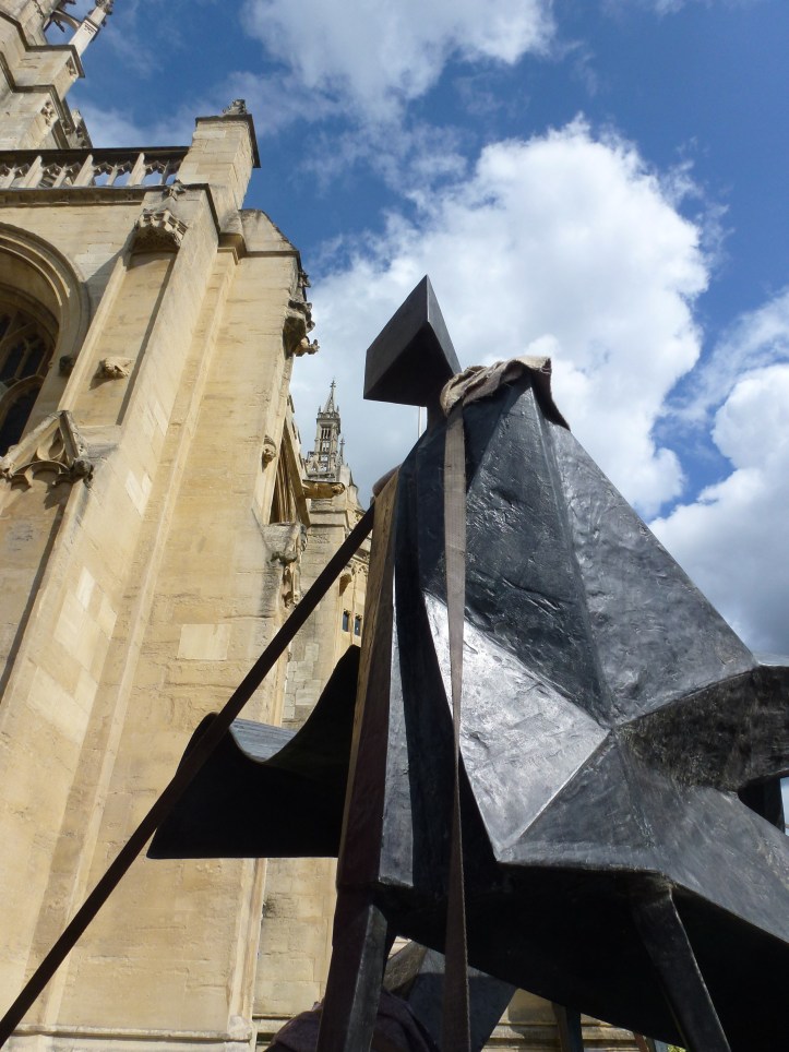 The image here is one I took at the time of the unloading of one of the main sculptures that stood outside the Cathedral at the second sculpture exhibition they did, the first one being so successful they did it twice! It’s two figures in bronze by Lynn Chadwick, with the guide straps holding it in place as they were manoeuvring it off the huge truck that brought it from the foundry in Stroud. Pangolin Editions were the foundry company and are still there in Stroud, casting many of the works of famous and not so famous artists, many of the artists living in the lovely valleys nearby. I was once told that there were more artists than postmen in the area, probably true.