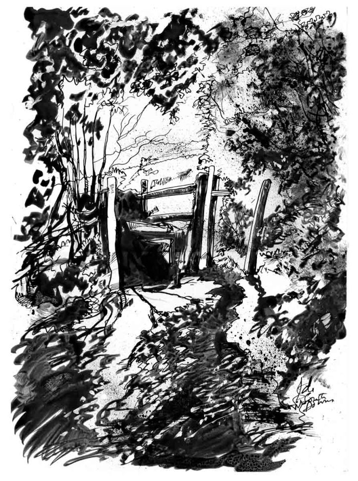 Middle left: Black and white drawing of a style from the South Downs Way. From about 3 or 4 years ago. We did a bit of walking around the area. I had a go at a large version of this recently and it started to look like a rather cheap chocolate box cover. It’s gone into the recycling bin. I might leave this one alone for a while. Soup gone wrong.