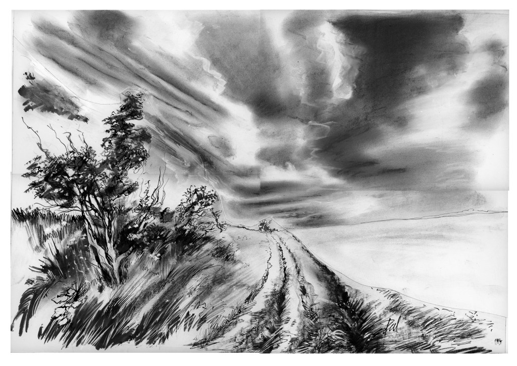 I call this Robin’s drawing, as it’s from a fine photo from my good friend Robin. Black and white ink drawing done some time ago now, certainly pre lockdown. I’m not sure exactly where it is but somewhere on the Cotswolds. There’s grey pastel added and one attempt at the sky was done again and the drawing glued together again. Cut out the old sky with a scalpel and transplanted the new one, with the help of today’s version of cow gum. So you should be able to see the join. It was also scanned in sections and joined together, so you can also see the joins there in places.