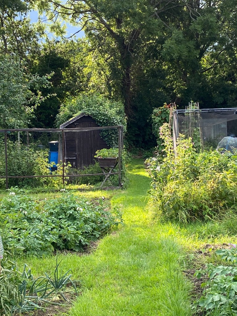 All the recent rain has made the allotment really green, and there’s more rain on the way, which is great. However I’ve not had such a great year so far on there. I was lucky enough to be gifted some squash and courgette plants from an allotment neighbour, and his plants have done well. Early spuds failed ( Only one row, but it’s the first time I’ve had spud failure ) Later ones have done ok but stalled a little in the very dry weather, now booming. So hopes are high. just hope the slugs don’t find them. A row of beetroot, generally a plant that germinates and grows brilliantly also evaporated, I have a few parsnips and they seem to have done ok…all in the lap of the gods, I’ve never grown them before so am hoping that they will have some great big rooty tooties. At their best to eat after a frost, so quite some time to wait.