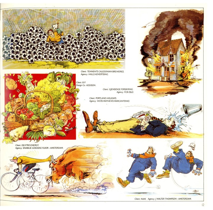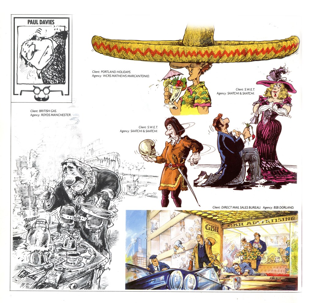 Through contacts I came into contact with an ‘artist’s agent’. I’d heard of these sort of people that represented illustrators but thought, wrongly, that they did not necessarily go about looking for work for ‘cartoonists’. The agent asked me if they could represent me, telling me that they took 25% of any fee they negotiated. Suited me fine. They got me loads of work. Loads. For a couple of years they published a little book of their artist’s work: just a couple of pages at most of each artists recent work shown in a book that they gave away to potential clients. Generated a lot of work.