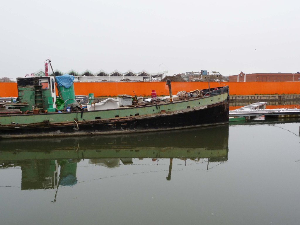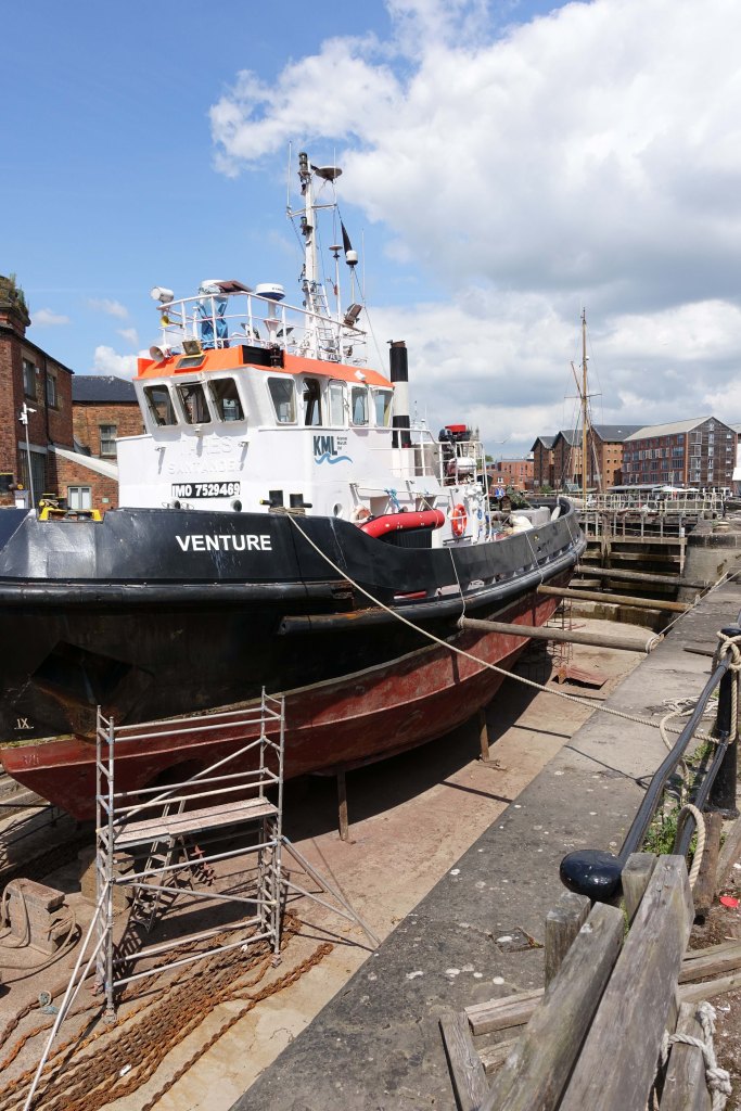 Down into the Docks basin. Sunny day and warm, security man watches another man power washing the steps down to the large area of warehouse, with Museums, narrow boats and big ships around by the dry docks at Nielsen’s Yard. I love this spot, where you can see an array of ships being repaired, refitted, and made, watertight again. A large ship is dockside, quick chat to a bloke on the stern to find out what it is. A former New Zealand Navy ship he tells me, it’s been in the Docks for a couple of years and they are putting the finishing touches to it to make it properly seaworthy. Someone else told me that it had been used in the past for smuggling drugs in the Caribbean, so a ship with a colourful past. I wonder what the new private owner will use it for other than its present use as a hole to pour money down. It’s about as large a ship you can navigate up the canal from Sharpness, though ‘he-man on poop deck’ told me that the tugboat in the dry dock had more trouble than they did as it is bigger below the water line.