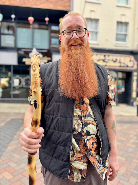 Going back up Westgate and skirting round a Wedding Party all done up in their finest we headed for the Docks. Here coming towards me a tall man with beard and a fancy stick, this sort of character is not unusual for Gloucester. James is a painter and decorater in his day job, but enjoys finding and whittling sticks, that match his shirt. A fine fellow. There’s always something to see in Westgate Street on a Saturday: the finest Tudor fronted House in the country ( see previous post ), a wedding, Northern Soul and a man who whittles sticks.