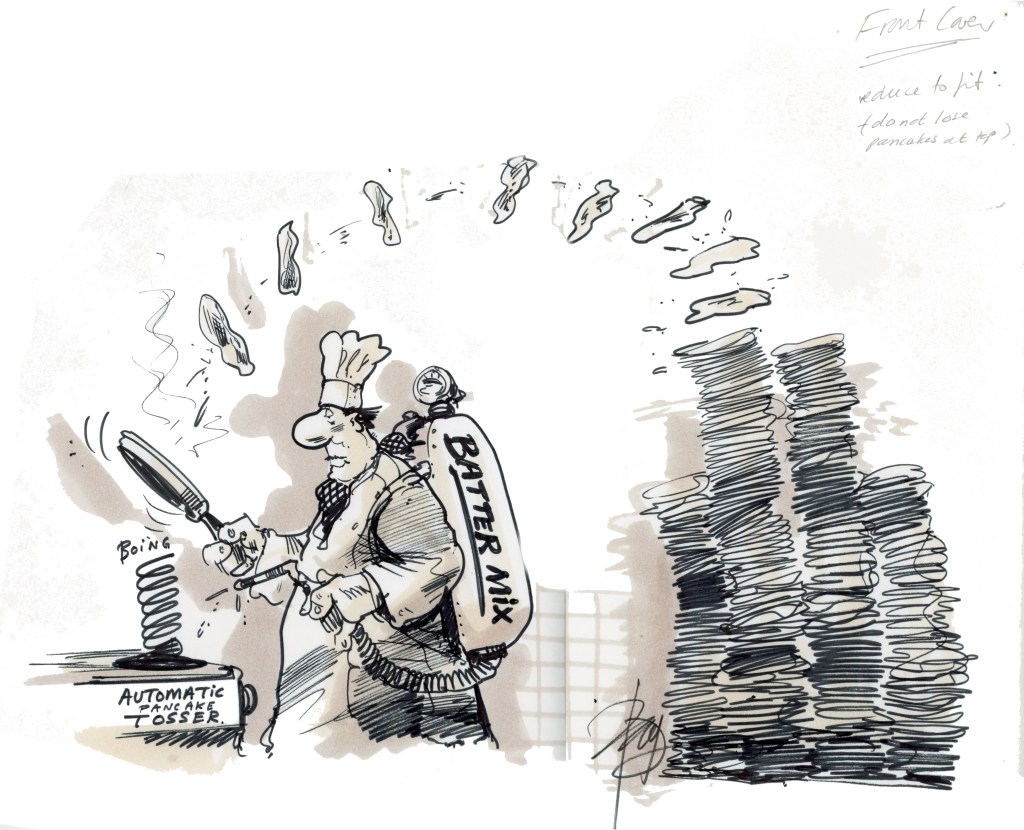 Another cartoon done for the English Tourist Board Magazine, many moons ago, for an edition that would include Shrove Tuesday, when we all make pancakes. Interestingly, the art editor has put a note at the top saying ‘don’t lose any of the pancakes at the top’ This is obviously a person who cares for my work.